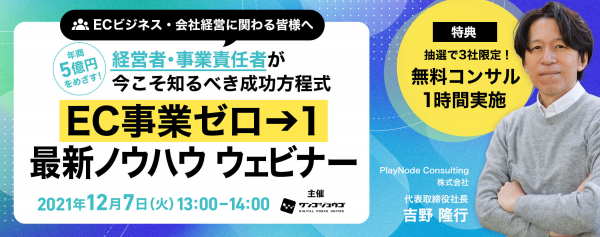 2021年12月7日(火)13:00 【中堅・中小企業が通販ビジネスで年商5億円をめざす!】 経営者・事業責任者が今こそ知るべき成功方程式EC事業ゼロ→1へ最新ノウハウ ウェビナー 開催のお知らせ