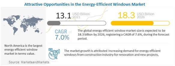 MarketsandMarketsは公開資料において、世界の省エネ窓(エネルギー効率の良い/高効率窓)市場は2021年中に131億ドル、2026年年までには183億ドルに成長し、2021年から2026年までのCAGRは7.0%になるとの予測結果を発表しました。