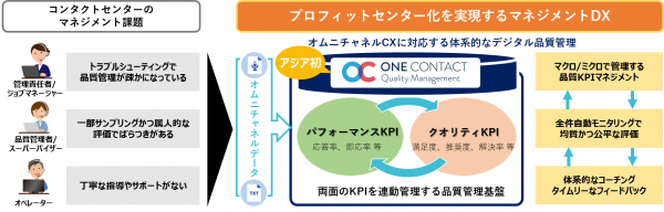 近年、企業における経営戦略では、コンタクトセンターをCXの戦略拠点としてプロフィットセンター化にすることが重要視されていますが、多くの国内企業では品質管理について課題を抱えています。この業界における永年課題の解決をめざし、グローバル基準の重要指標(KPI)をマネジメントする品質管理のDX基盤『ONE CONTACT Quality Management』を活用したセンター運営を2021年10月20日にリリースいたしました。