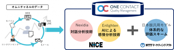 『ONE CONTACT Quality Management』は、ナイスジャパンが提供する音声ファイルやテキストデータなど非構造化データを定量化する技術「Nexidia」とAIを活用したお客さまやオペレーターの感情・行動を定量化する技術「Enlighten」をベースに、NTTマーケティングアクトが培った品質管理の日本版汎用モデルや体系的な評価スキームを盛り込んだ、日本語に対応するアジア初のコンタクトセンター品質管理のDX基盤です。