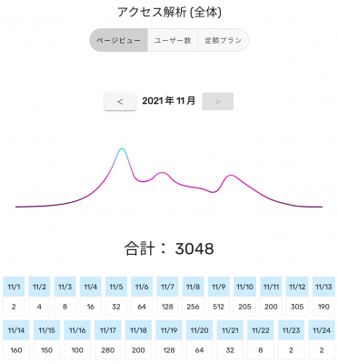 本機能では、ページビュー、ユーザー数、定額プランユーザーによる日ごとのアクセス数を見ることができます。