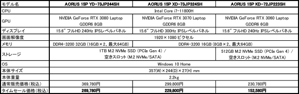GIGABYTE、Amazonのブラックフライデーセールにおいて「AORUS 15P」3モデルを特価にて数量限定販売