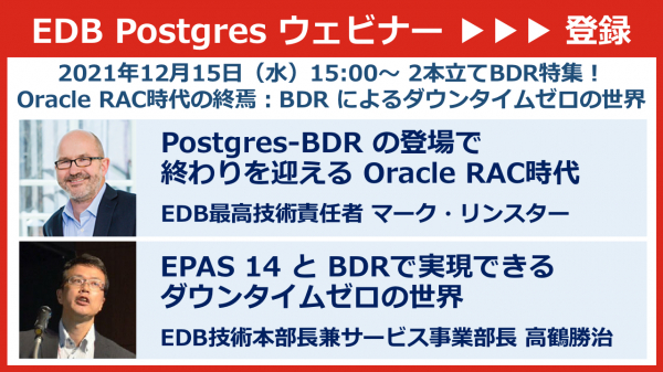 PostgreSQLによるイノベーションを支援するEDBは「Oracle RAC時代の終焉:Postgres-BDR によるダウンタイムゼロの世界」と題するウェビナーを12月15日(水)に開催する。