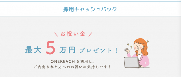 『ONEREACH(ワンリーチ)』を通じて、内定された方に最大5万円のキャッシュバックを行います。