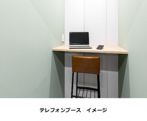 通話やWEB会議専用の個室の「テレフォンブース」は、テレワークによるリモート会議や、取引先への電話に便利です。事前予約制、無料で利用できます。