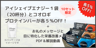 この度、コオロギプロテインバー「CRICKET PROTEIN BAR」を提供しているAFICEANT(本社:東京都中野区)とクラウドファンディングのリターンでコラボし、カロリーが気になる方に、原材料として砂糖を使用していないアイシェイプエナジーと、砂糖無添加・添加物未使用の自然食品であるコオロギプロテインバー「CRICKET PROTEIN BAR」をそれぞれ5%OFFでご提供するコラボリターンを追加いたします。