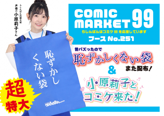 コミケ99(新C99)「恥ずかしくない袋」配布! 小原莉子さんが応援大使に就任!らしんばん出展/中古アニメショップらしんばん