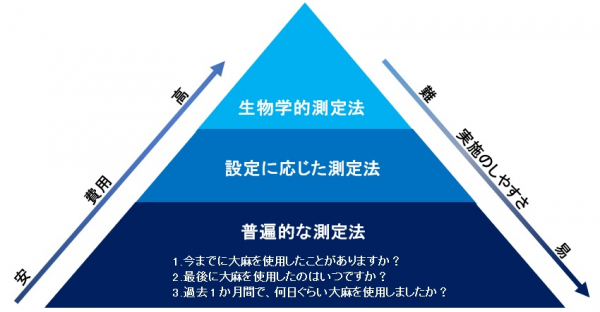 図1 専門家のコンセンサスに基づく、大麻使用量を定量化するための最低基準の枠組み。最下層から順に、測定法は費用が高くなり、実施のしやすさは易しくなる。