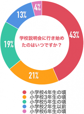 ご回答いただいた方の説明会に行き始めた時期は、「小学校4年生」が最も多く43%、「小学校3年生」が21%、「小学校5年生」が19%、「小学校2年生」が13%、「小学校6年生」が4%でした。