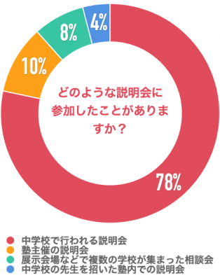 「中学校で受ける説明会」が78%、「塾主催の説明会」は10%、「展示会場などで複数の学校が集まった相談会」が8%、「中学校の先生を招いた塾内での説明会」が4%という回答でした。