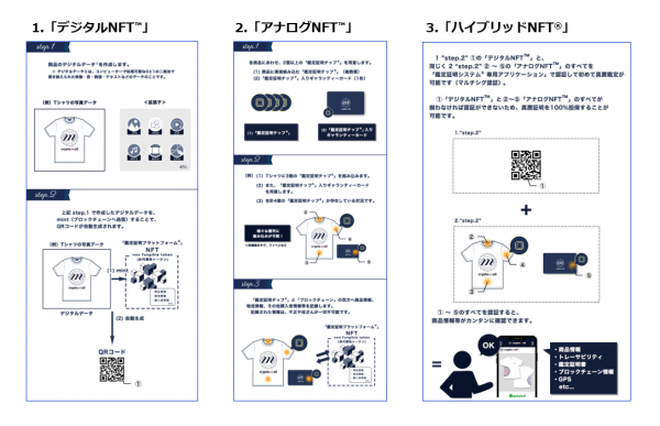「ハイブリッドNFT(R)」とは、「デジタルNFT(TM)」と「アナログNFT(TM)」を組み合わせたものをいいます。それら2点以上を認証させることにより、「ニセモノ・パクリ商品」問題を100%解決する仕組みを発明いたしました。