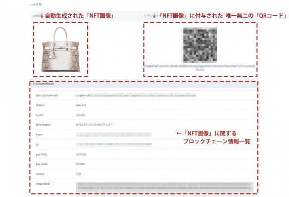 自動生成された「NFT画像」には、唯一無二の「QRコード」が付与されます。当該「QRコード」(=「デジタルNFT(TM)」)と商品に埋入・貼付・組み込みされた「鑑定証明チップ(R)」、もしくは、「『鑑定証明チップ(R)』入りギャランティーカード」(=「アナログNFT(TM)」)とを「鑑定証明システム(R)」スマートフォンアプリで認証して初めて真贋証明が成立する設計となっております(「マルチシグ認証」)。