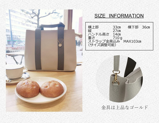 サイズ:縦27cm、横(底部)34cm、マチ(底部)15cm、ハンドル高さ14cm、ストラップ金具込みMAX103cm