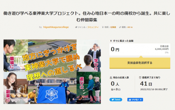 「働き遊び学べる東神楽大学プロジェクト。住み心地日本一の町の廃校から誕生。共に楽しむ仲間募集」
