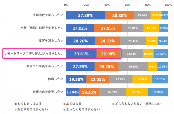 各項目に対して「とてもあてはまる」「あてはまる」と回答した割合が、コロナ禍では「通勤回数を減らしたい(66.77%)」、「出社(出勤)時間を変更したい(54.97%)」、「接客を減らしたい(52.79%)」と続いた(図3)。