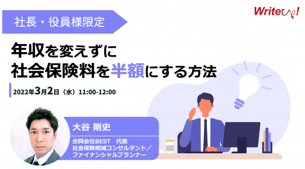本セミナーでは、社会保険削減コンサルタント/ファイナンシャルプランナーとして活躍する合同会社BEST 大谷氏にご登壇いただき、社会保険料の負担が大きいとされている会社経営者・役員の方限定で社会保険料を抑えるための対策方法を解説いただきます。