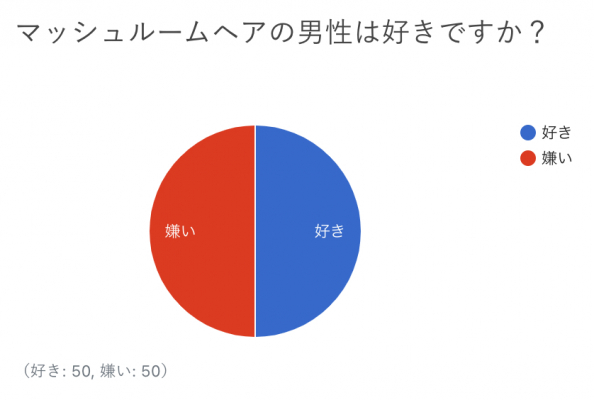 「マッシュルームヘアの男性は好きですか?」の質問では、「好き」が50%、「嫌い」が50%という結果となりました。