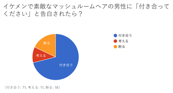 「イケメンで素敵なマッシュルームヘアの男性に“付き合ってください”と告白されたら?」の質問では、付き合うが71%、考えるが11%、断るが18%という結果となりました。