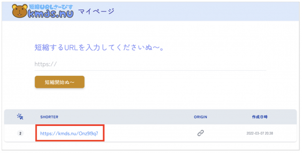 すぐに、短縮されたURLが発行されます。