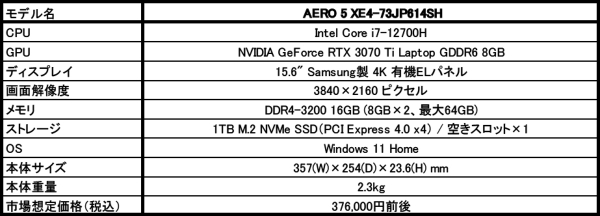 2022年4月27日 - GIGABYTE Technology Co., Ltd. 台湾・新北市 - コンピュータテクノロジーで世界をリードするGIGABYTE Technologyは、CPUに第12世代Intel Core i7プロセッサ、GPUにNVIDIA GeForce RTX 3070 Tiを搭載したクリエイター向け15.6型ノートPC「AERO 5 XE4-73JP614SH」を家電量販店(ソフマップ、ビックカメラ、ヨドバシカメラ)を通して4月28日より販売を開始いたします。市場想定価格(税込)は、376,000円前後です。