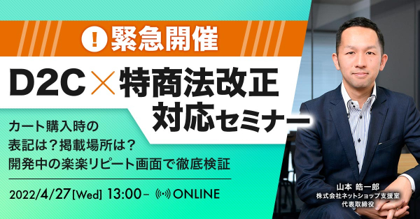 【4月27日(水)開催オンラインセミナー】【緊急開催】D2C ? 特商法改正対応セミナー〜カート購入時の表記は?掲載場所は?開発中の楽楽リピート画面で徹底検証〜