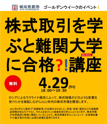 ついに高校で金融を学ぶ時代が到来。4月29日、城南推薦塾では、「株式取引を学ぶと難関大に合格?!講座」をオンラインで開講します。