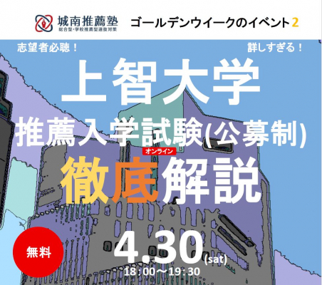 効率良く上智大学に合格するための方法を公開。4月30日、城南推薦塾がオンラインガイダンス「上智大学推薦入学試験(公募制)徹底解説」を開講します。