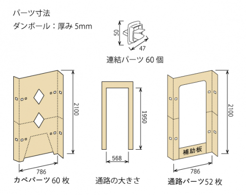 ダンボール迷路トールR3に引き続き、組み立てには連結パーツ(プラスチック製ジョイント)を採用し、繰り返しの設置・分解・収納が可能です。