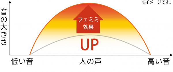 人の声を中心に増幅しますので、人の声がより聞きやすくなります。(図はフェミミ効果のイメージです)