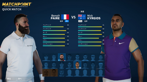 クイックマッチには、世界の第一線で活躍する16選手が実名で登場。日本が誇る錦織圭選手(以下選手敬称略)はもちろん、テイラー・フリッツ(アメリカ合衆国)ガルビネ・ムグルサ(スペイン)、ニック・キリオス(オーストラリア)、ブノワ・ペール(フランス)、アマンダ・アニシモバ(アメリカ合衆国)など、若手からベテランまで個性豊かな選手たちを選択することができます。
