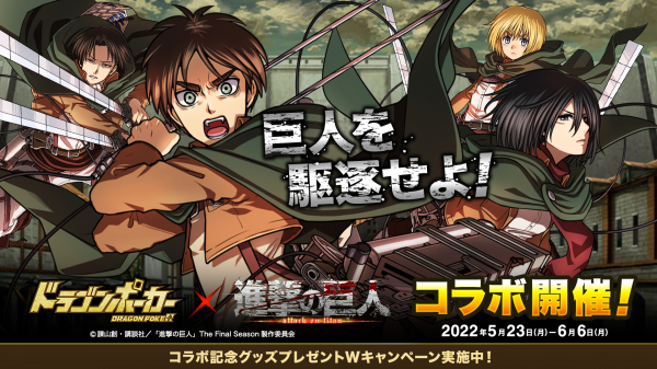 株式会社アソビズム(本社:東京都千代田区、代表取締役:大手智之)は、App Store・Google Playにて好評配信中の『ドラゴンポーカー』とTVアニメ『進撃の巨人』のコラボを記念して、「調査兵団プレゼントキャンペーン」を、2022年5月16日(月)より実施することをお知らせいたします。