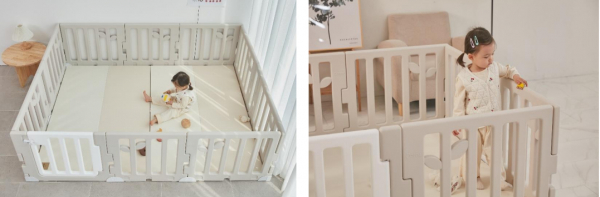 Caraz製のプレイマットと組み合わせて使用することで、マットとベビーサークルの隙間なくピッタリと使用できる設計となっているため、隙間に手足を挟み込んだり、小さなおもちゃやゴミなどが入り込みにくく、より安全でお掃除しやすくなりました。