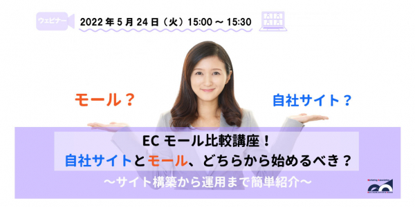 ECサイトの運営代行サービスを提供しているマーケティングアソシエーション株式会社(本社:東京都台東区 代表取締役:相内あゆ美、以下当社)は、2022年5月24日(火)に、ウェビナー「ECモール比較講座!自社サイトとモール、どちらから始めるべき?〜サイト構築から運用まで簡単紹介〜」を開催いたします。