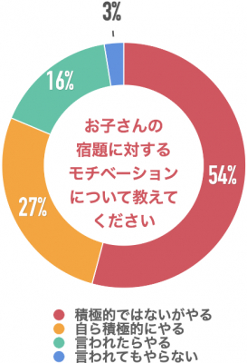 1. お子様の宿題に関するモチベーションで多かった回答は、積極的ではないがやる。