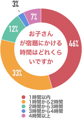 「1時間以内」が46%、「1から2時間」が33%、「2から3時間」が12%、「3から4時間」が3%と「4時間以上」が7%という回答でした。