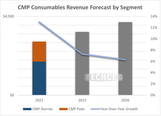 電子材料ビジネスおよび技術情報を提供するアドバイザリー企業であるTECHCETは半導体向け化学機械平坦化(CMP)消耗品市場は2021年に30億ドルに達し、約13%で成長したことを発表しました。CMP市場はスラリーとパッドの両市場が2022年に33億ドル、9%で成長し、2026年までには年平均成長率(CAGR)6%以上の成長を遂げることが予測されています。