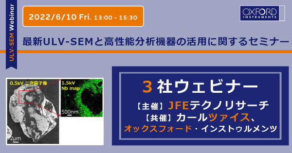 このウェビナーは、JFEテクノリサーチ株式会社(主催)、カールツァイス株式会社(共催)、そしてオックスフォード・インストゥルメンツ株式会社(共催)の3社が、解析事例も含め、ULV-SEM関連の最新事情と実務に役立つ情報についてご紹介します。
