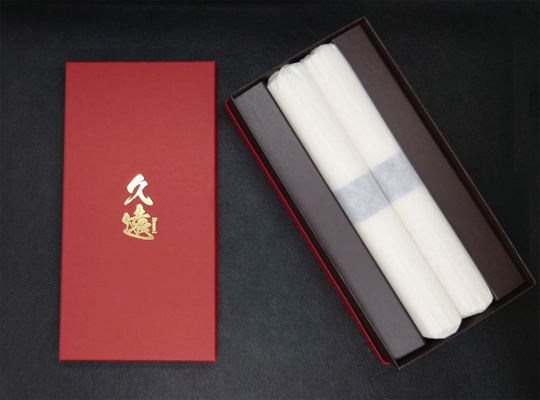 【原材料オール徳島産 半田手延麺 久遠】は、徳島県美馬産小麦粉100%、徳島県鳴門産「うず塩」100%、徳島県産えごま油100%という原材料全て徳島県産を使用した業界初の「半田そうめん」です。さらに、麺を巻いている紙も徳島県の伝統産業である「阿波和紙」を使用しており、徳島県産にこだわり抜いた逸品となっています。