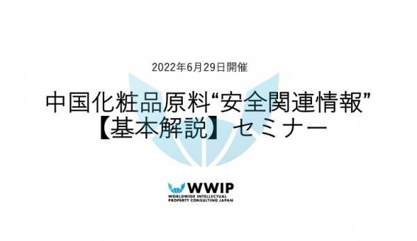 株式会社ワールドワイド・アイピー・コンサルティングジャパン (以下「WWIP」 : 東京都港区) は、2022年6月29日(火)13:30〜15:00に、「中国化粧品原料“安全関連情報”【基本解説】セミナー」を開催いたします。