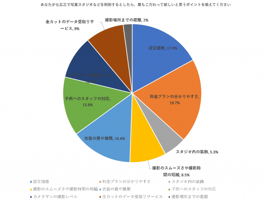 あなたが七五三で写真スタジオなどを利用するとしたら、最もこだわって欲しいと思うポイントを教えてください。 と尋ねたところ、「設定価格」(17.0%)、「料金プランの分かりやすさ」(19.7%)、「スタジオ内の装飾」(5.3%)、「撮影のスムーズさ撮影時間の短縮)」(8.5%)、「衣装の質や種類」(14.4%)、「子供へのスタッフの対応」(13.8%)、「カメラマンの撮影レベル」(10.1%)、「全カットのデータ受取りサービス」(10.1%)、「撮影場所までの距離」(2.1%)という結果となりました。
