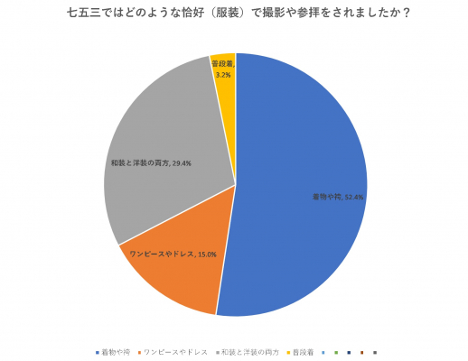 撮影をした人に七五三ではどのような恰好(服装)で撮影や参拝をされましたか? と尋ねたところ、「着物や袴」(52.4%)、「ワンピースやドレス」(15.0%)、「和装と洋装」(29.4%)、「普段着」(3.2%)という結果となりました。