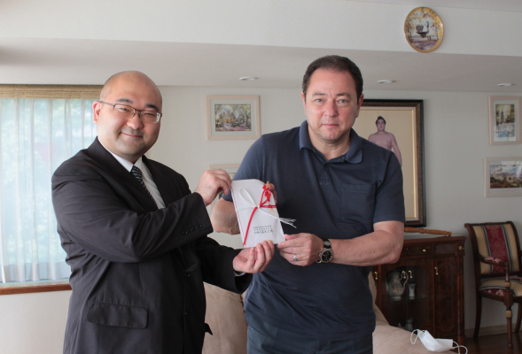 6月28日、ウクライナ大使館を四国商事の濱本会長・濱本社長が訪問し、セルギー・ウォロディミロヴィチ・コルスンスキー在日ウクライナ大使館特命全権大使へ、300セット分の売上450,000円を贈呈しました(写真)。