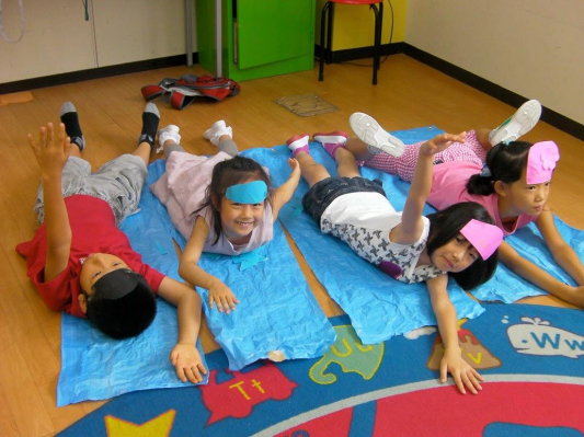 海や山、ジャングルなど、教室に居ながらにして、色々な場所でキャンプが楽しめます。キャンプに必要な道具は、自分たちで作ります。 キャンプならではのゲームや歌も盛りだくさん。双眼鏡を持って、色々な場所の探検を英語で行います。
