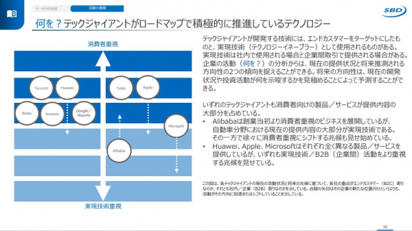 英国に本社を置き自動車技術に関する調査およびコンサルティングを手掛けるSBD Automotiveジャパン(名古屋市)では、自動車分野に関連する主要なテックジャイアントを紹介し、なぜ(自動車/モビリティ分野に関心を抱く動機)、何を(取り組み)、どのように(戦略)の観点から各企業の相対的な位置付けを明示し、動向を解説したレポート「自動車業界におけるテックジャイアントのロードマップ」を2022年7月4日に発行しました。
