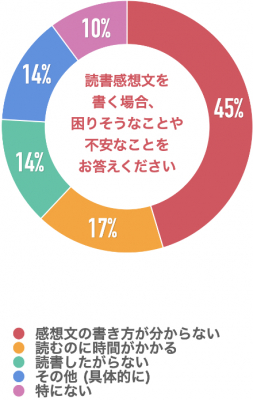 「感想文の書き方が分からない」が45%、「読むのに時間がかかる」が17%、「読書したがらない」が14%、「その他(具体的に)」が14%と「特にない」が10%という結果になりました。