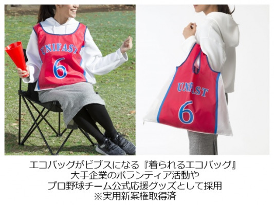 当社が開発した「着られるエコバッグ」は、レジ袋削減につながるエコバッグが、応援用ビブスも兼ねており、スポーツとSDGsへの貢献を両立したオリジナル製品です。実用新案権も取得し、大手企業のボランティア活動やプロ野球チーム公式応援グッズとして採用されています。