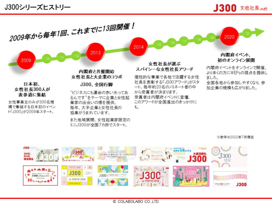 日本最大級の女性起業家の為の祭典。女性起業家・個人事業主のみ300名が集結し2009年よりスタートしました。“女性社長300人が不況を吹っ飛ばす”を合言葉に、横浜市長 林文子氏はじめ竹中平蔵氏、秋元康氏など著名人も参加。現在は全国各地の女性社長の協力のもと、地方での「ミニJ300」開催、「J300アワード」表彰を実施しています。2013〜2020年度には、J300と同時開催で、内閣府共催の「企業×女性起業家マッチングイベント」も開催、2021年度は、文部科学省における次世代アントレプレナー育成事業の一環として、お茶の水女子大学及び「産官学グローバル連携によるEDGE NEXTプログラム」の主催で実施された『女性の起業が社会を変える』に女性社長.netが特別協力しました。