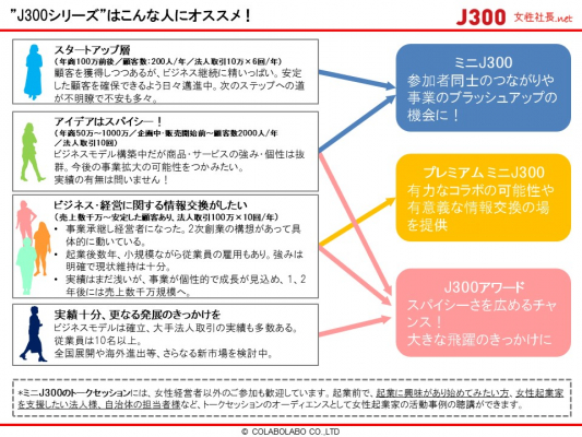 各地イベント開催情報や「J300アワード」公募情報などの最新情報は女性社長.netのFacebookページで告知してまいります。