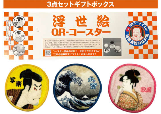 QRコード付き浮世絵コースターは、歌麿、写楽、北斎をはじめとした江戸後期の浮世絵師たちの作品で彩られたタオル地のコースター。吸水性がよく、水滴のつく夏のグラスにぴったりな商品です。洗って何度でも使えます。