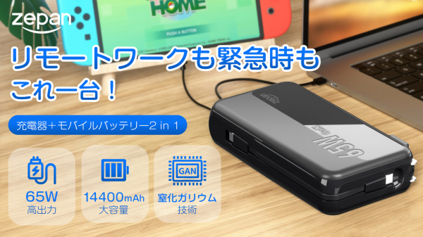 充電器とモバイルバッテリー2in1、65WハイパワーでノートPCも楽々充電!「zepan PD65」が公開初日に目標達成!